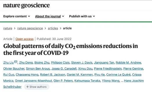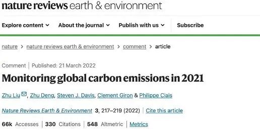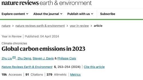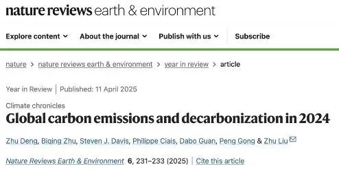On April 11, the Carbon Monitor team published its annual review titled "Global Carbon Emissions and Decarbonization in 2024" in Nature Reviews Earth & Environment (5-year Impact Factor: 54.6), marking the fifth consecutive year of releasing global daily-scale carbon emission data. Dr. Deng Zhu, a recent PhD graduate from the Department of Earth System Science at Tsinghua University, served as the first author of the paper. Professor Liu Zhu from the Institute for Carbon Neutrality and the Department of Earth System Science at Tsinghua University was the corresponding author. Co-authors included Dr. Zhu Biqing from the International Institute for Applied Systems Analysis (IIASA), Professor Steven Davis from Stanford University, Professor Philippe Ciais from the Laboratoire des Sciences du Climat et de l'Environnement (LSCE), Professor Guan Dabo from Tsinghua University’s Institute for Carbon Neutrality and Department of Earth System Science, and Professor Gong Peng from the Department of Geography at the University of Hong Kong. The research was supported by the Carbon Neutrality and Energy System Transformation (CNEST) multilateral cooperation program.