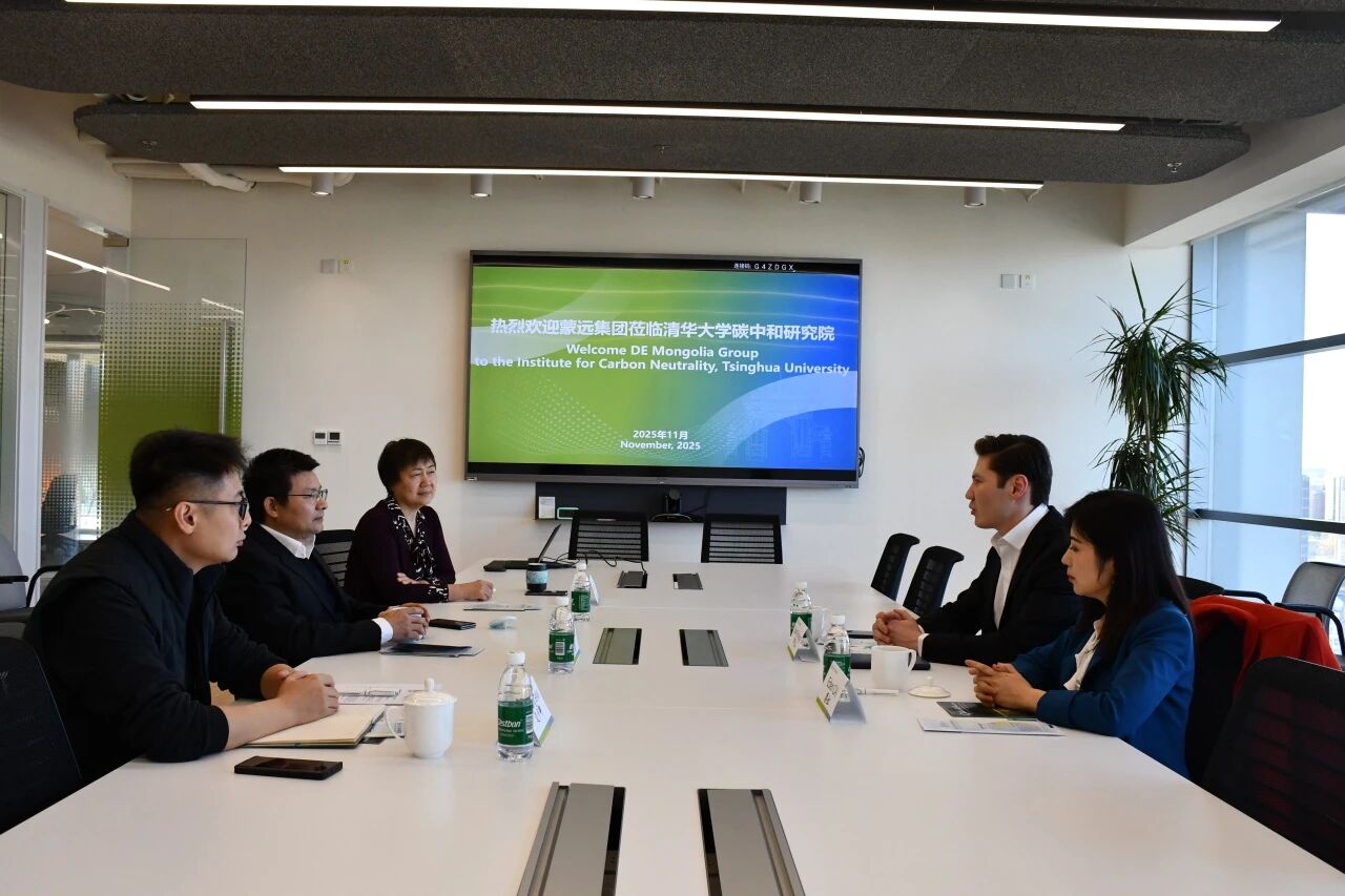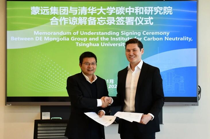 11月27日,蒙古蒙远集团(DE Mongolia Group)再次到访清华大学碳中和研究院,在前期充分沟通和交流的基础上,围绕双方在碳中和与能源转型领域的合作进行了深入讨论,并正式签署《清华大学碳中和研究院与蒙古蒙远集团合作谅解备忘录》。此次来访由蒙远集团首席执行官 Dash Enkhbayar(印达山)和顾问 Eden Cai(蔡虹)共同参加,清华大学碳中和研究院副院长王哲、研究员孙炘以及海外合作高级主管边少卿出席会谈。双方在简短而庄重的签署仪式上正式完成了备忘录的签署,标志着合作迈入新的阶段。