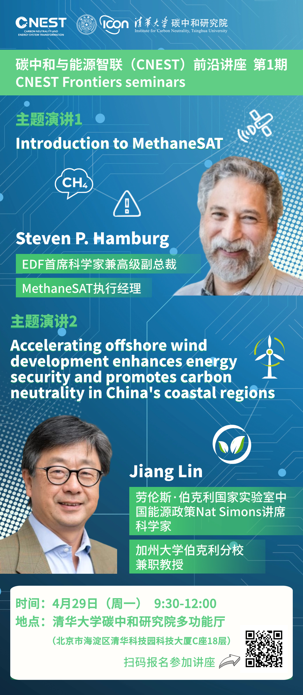 2024年4月29日,碳中和与能源智联(CNEST)前沿讲座第1期将在清华大学碳中和研究院多功能厅举办。活动将邀请美国环保协会(EDF)首席科学家兼高级副总裁Steven P. Hamburg、美国劳伦斯·伯克利国家实验室中国能源政策Nat Simons讲席科学家Jiang Lin进行主题演讲,并就相关话题进行交流讨论。欢迎报名参加!