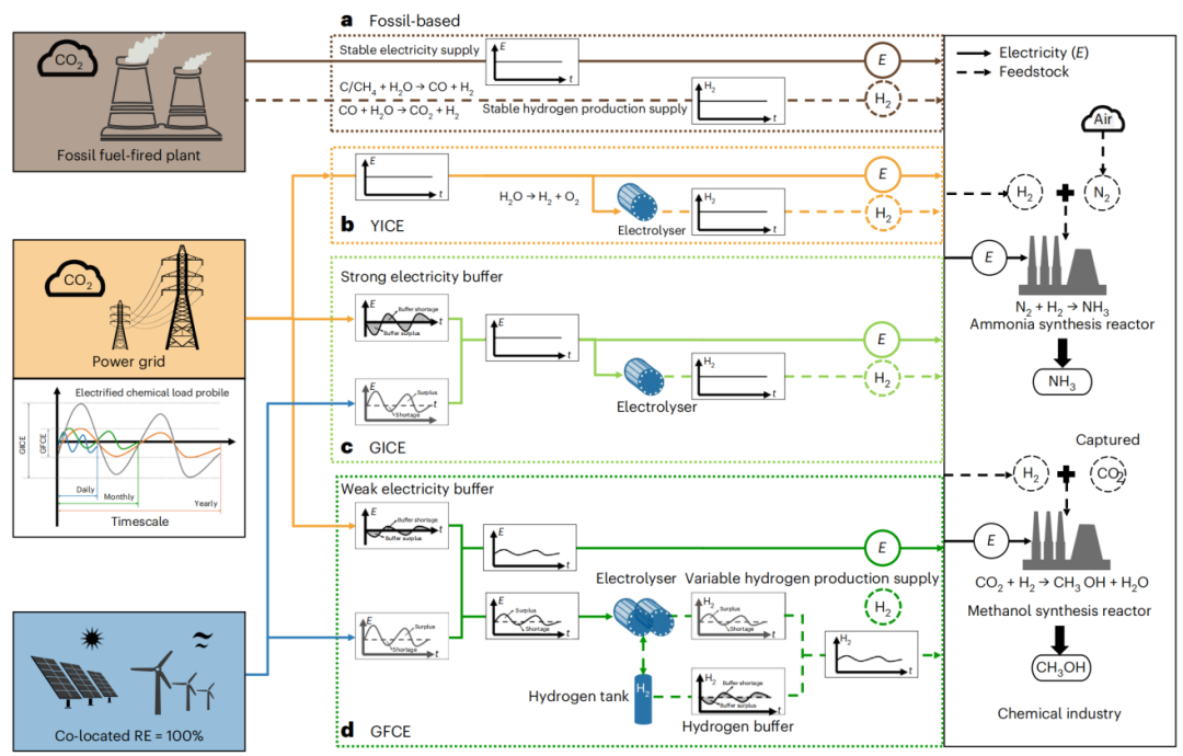 现有的化工电气化路径主要依赖于电网电力,但这往往会将碳排放从化工行业转移到电力行业,甚至可能增加全国的碳排放总量。为此,研究团队提出了一种新的思路——“绿色柔性化工电气化”(GFCE)路径。该路径通过绿电直连的方式构建一体化系统,并结合先进的氢氨醇耦合控制与调度技术,实现化工生产过程的深度电气化。与仅依靠网电的电气化路径相比,GFCE路径不仅能够显著减少电力和化工行业的碳排放,还能通过电氢协同的运行优化,降低对电网的冲击,增强电力系统的安全性。