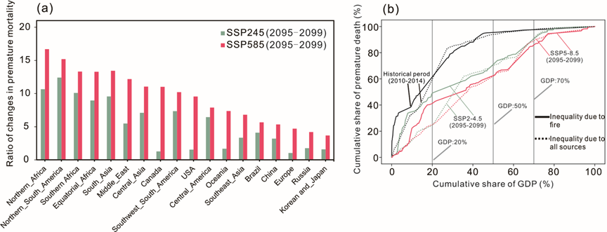 研究发现,随着气候变暖与干旱加剧,未来全球野火活动将显著增强。在中等排放情景(SSP2-4.5)下,到本世纪末,全球野火碳排放与当前水平相比预计增加约23%,全球每年约有140万例过早死亡可归因于野火烟雾PM2.5暴露,为当前水平的6倍(图1)。全球变暖不仅加剧野火污染健康风险,也改变了其在不同区域和经济体之间的分布特征。欠发达地区在全球未来野火健康负担中的占比仍然巨大,然而在全球高升温情景(SSP5-8.5)下,未来发达国家地区野火活动大幅增多,在人口老龄化趋势下,其野火健康风险在全球的占比将明显提升,影响了野火PM2.5暴露健康风险的区域差异化格局(图2)。