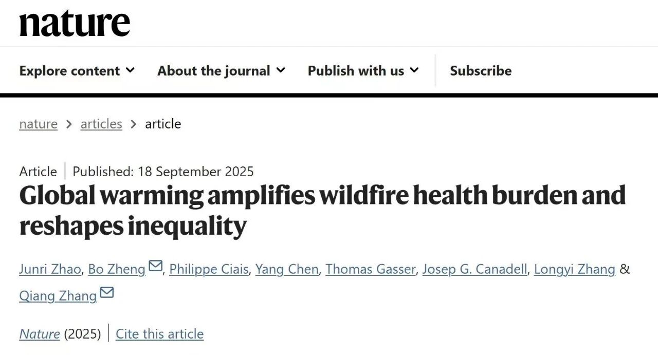 研究成果以“全球变暖加剧野火健康负担并重塑不平等格局”(Global warming amplifies wildfire health burden and reshapes inequality)为题,以“加速预览”文章(Accelerated Article Preview)的形式在线发表于《自然》(Nature)期刊上。该研究是团队继2023年在《科学》(Science)上发表北半球中高纬地区野火碳排放变化及驱动力解析成果,以及本月10日在《自然》(Nature)上发表极端野火烟雾长距离传输全球影响成果之后,在全球野火排放与气候环境效应方面的又一项重要成果。
