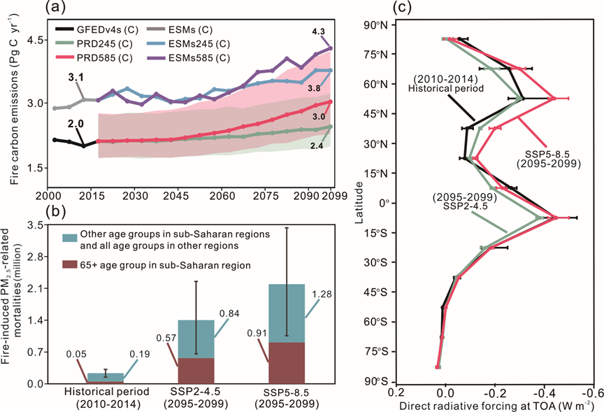 图1. 野火排放的历史变化、未来预测及其对PM2.5健康效应和直接辐射强迫的影响