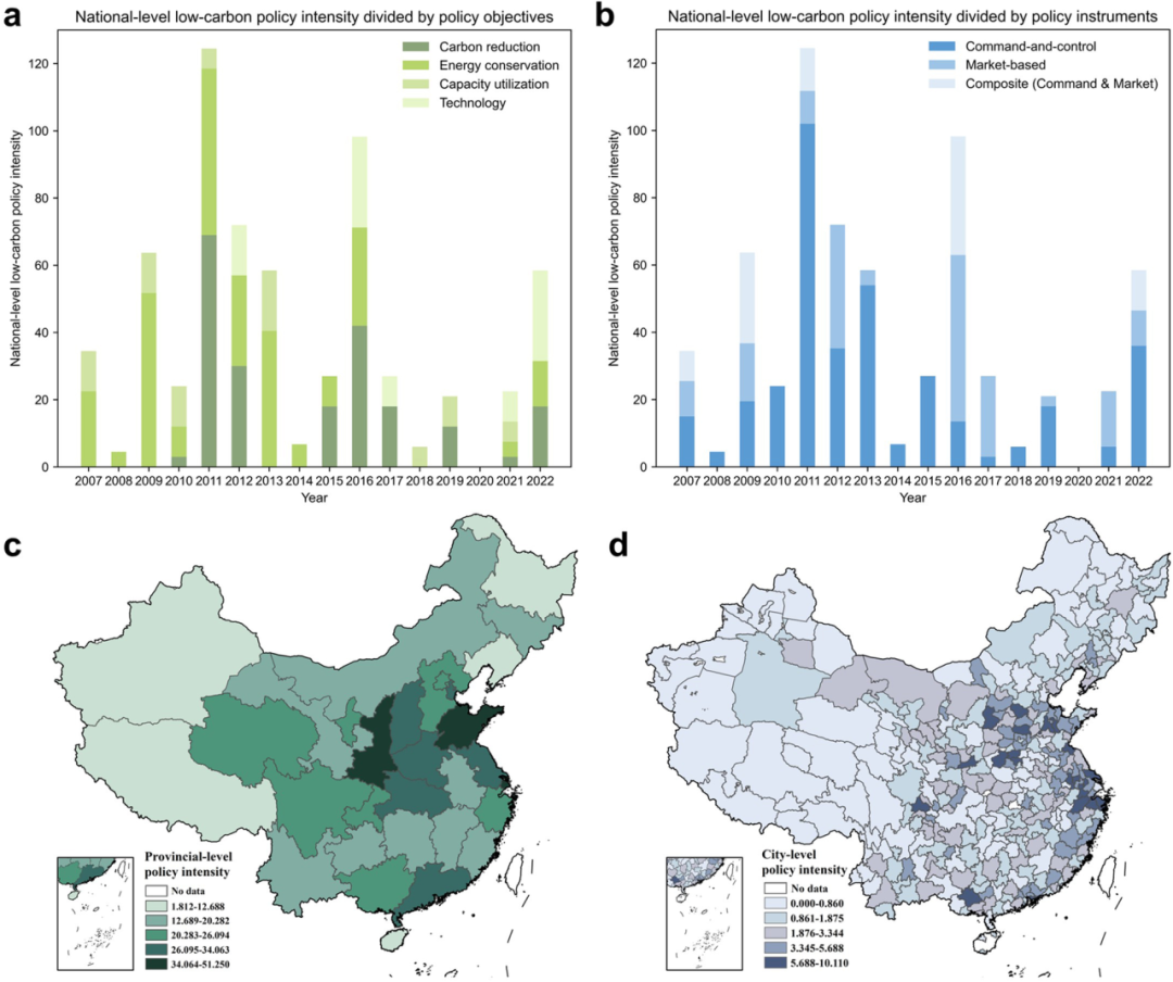 为了反映低碳政策强度的异质性,该研究进一步聚合得到了包含三类政策层级、四类政策目标、三类政策工具的子指数。研究发现,国家层面的低碳政策强度具有较强的周期性,其中2011年和2016年(即中国“十二五”和“十三五”计划的开局年)强度较强。从政策目标看,节能政策具有较好的连续性,而降碳政策在2009年中国首次提出碳减排目标后从2010年开始有了独立的政策。从政策工具看,虽然2015年之前低碳政策以命令控制型政策为主,但2015年后经济激励型和综合类政策工具的贡献更大。