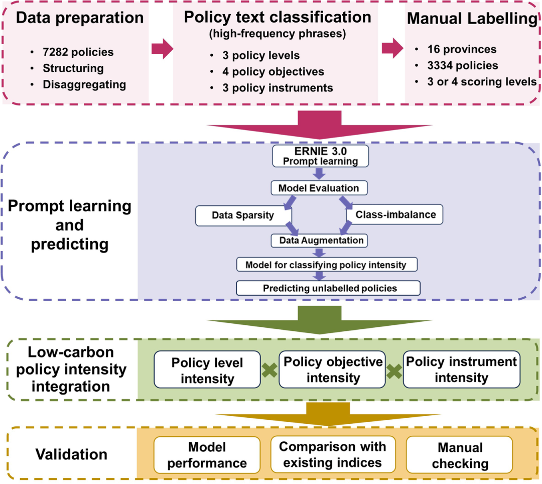 针对上述问题,该研究基于自然语言处理和ERNIE3.0小样本提示学习的混合模型对政策清单中的7282条低碳政策开展政策强度量化,提供了一套覆盖数据收集与清洗、政策文本分类、评分体系构建、政策强度量化、模型训练及验证的全流程透明可重复的政策评估新范式(如图1所示)。