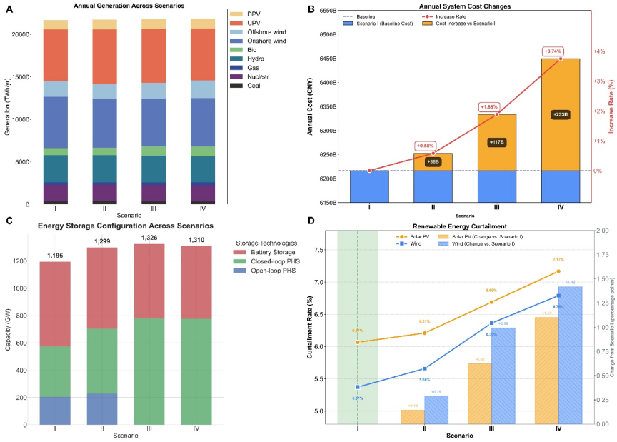 图3. 各建模情景的系统级结果对比。(A: 年度发电量结构;B: 年度系统总成本变化;C: 储能装机结构;D: 风光弃电率变化)