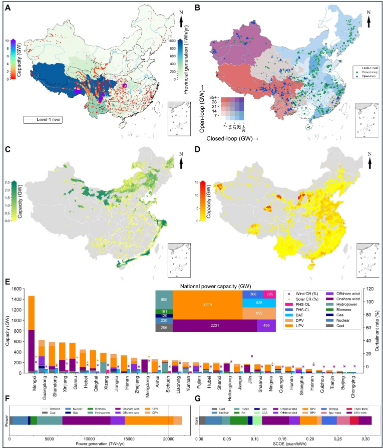 图2. 2060年中国电力系统基准情景优化结果。(A: 水电装机及发电量分布;B: 抽水蓄能装机分布;C-D: 风电和光伏装机分布;E: 分省装机结构及弃电率;F: 全国发电结构;G: 系统度电成本)
