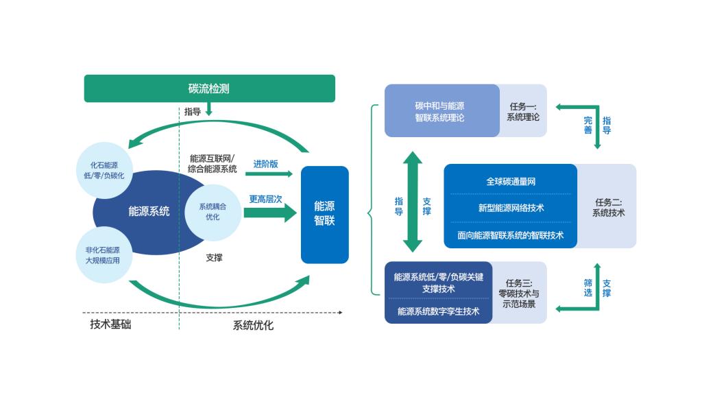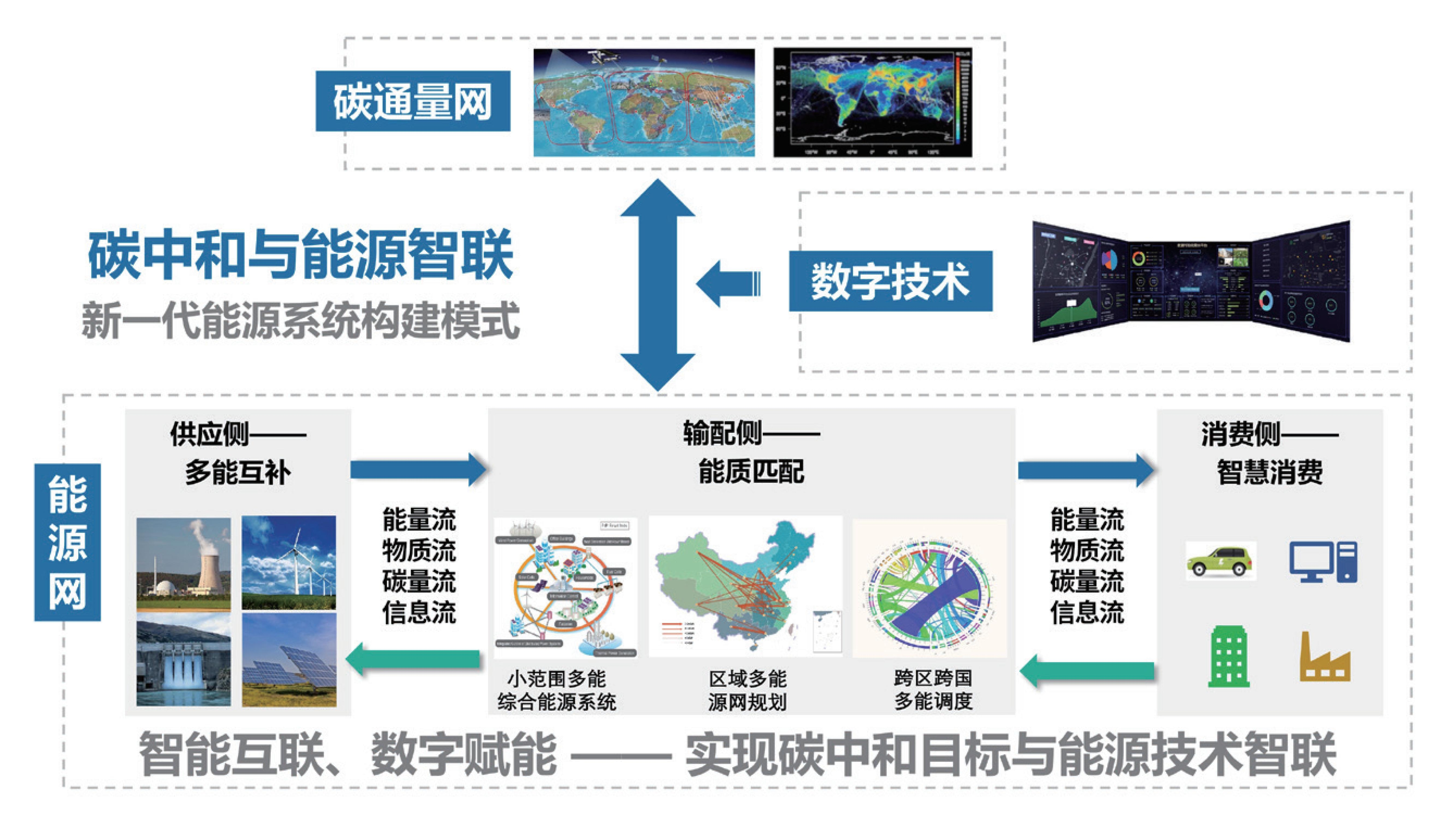 基于全球碳流监测,以智联为发展模式,融合信息流、能量流、物质流和碳量流,充分运用人工智能技术来学习、挖掘能源系统大数据的优化和决策潜力,构建新型能源智联系统。能源智联系统在以大电网为主要纽带的基础上强调能源生产和消费的相互平等优化匹配,瞄准实现大范围“多能互补、能质匹配”,并进而完善能源消耗总量和强度调控,优化能源产供储销体系建设,确保能源安全,优化实现碳中和。
