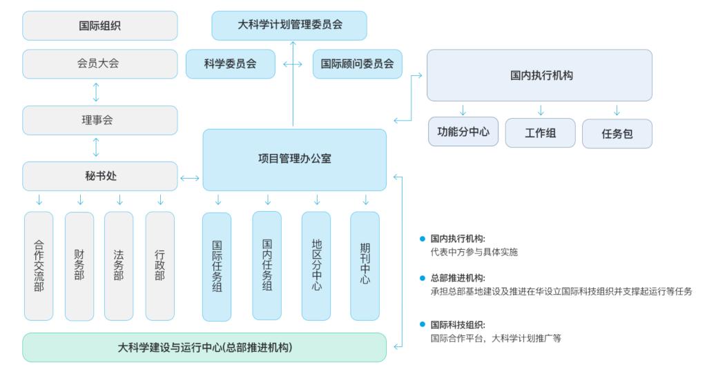 依据科技部文件《我国牵头组织的国际大科学计划和大科学工程立项后相关实施工作管理办法(试行)》(国科发外[2023]151号),开展组织架构和运行机制设计与建设。